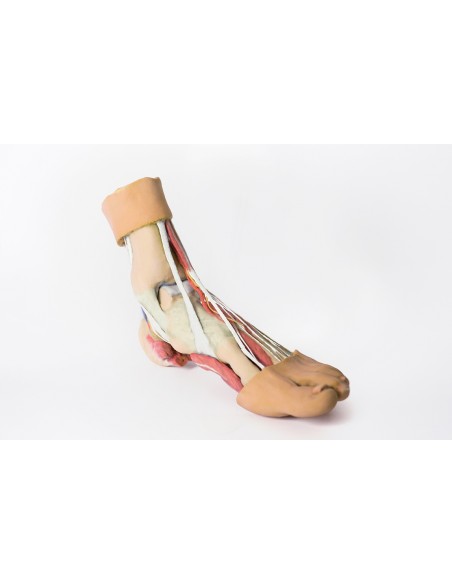 Este modelo de disección impreso en 3D muestra la anatomía de la parte distal de la pierna derecha y las estructuras profundas de la superficie plantar del pie.