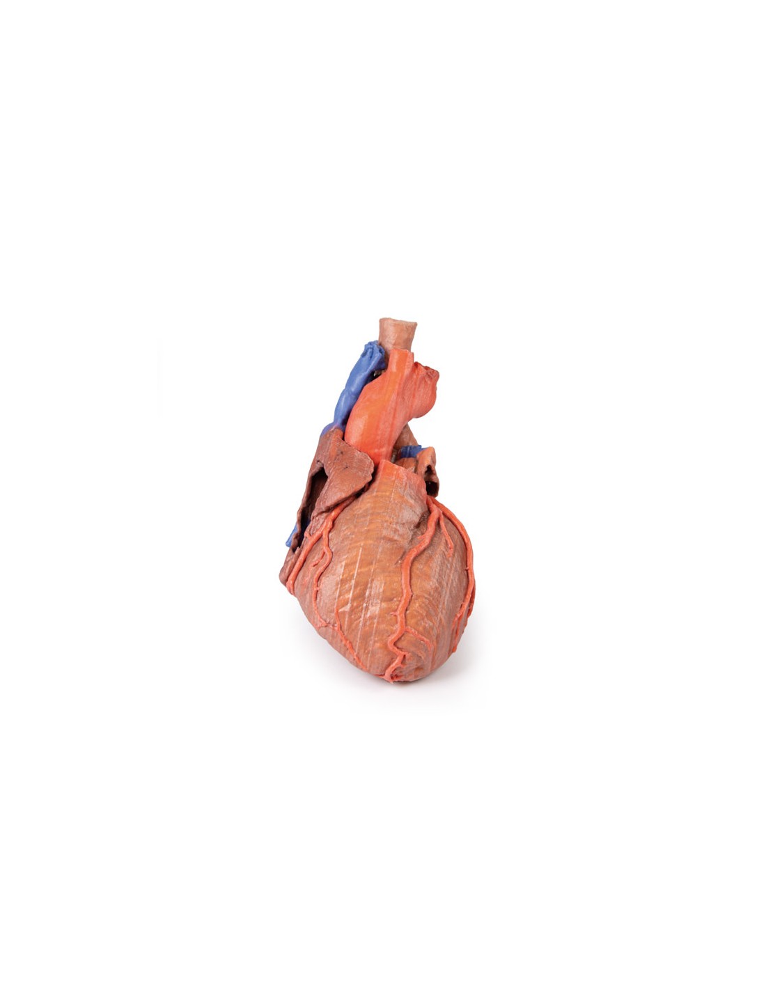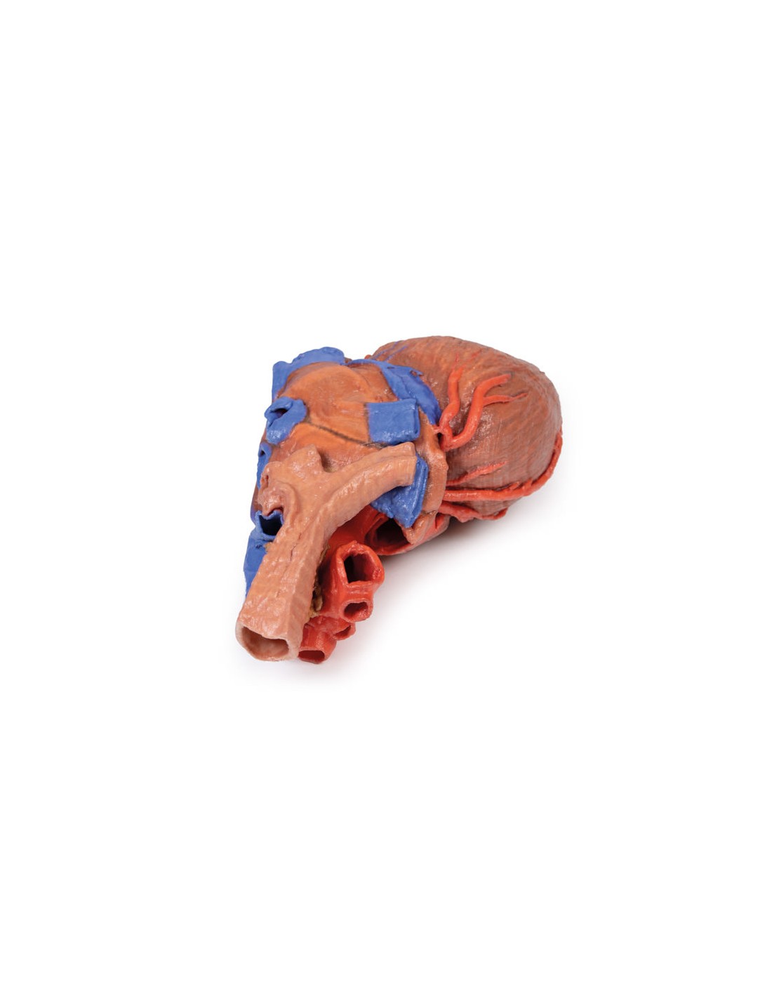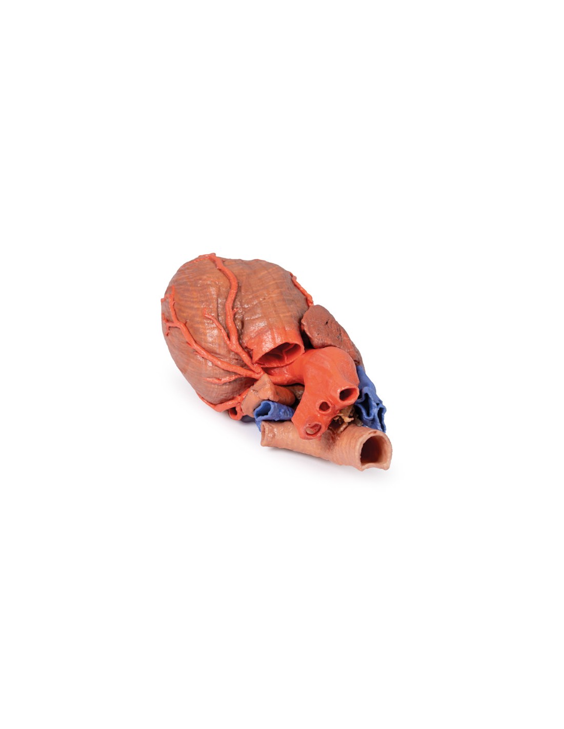 Este modelo anatómico impreso en 3D del corazón conserva la anatomía externa del corazón y la tráquea distal, la carina y los bronquios primarios en el mediastino posterior en relación con los grandes vasos y la aurícula izquierda (que muestra los reflejos pericárdicos de los senos pericárdicos transverso y oblicuo).