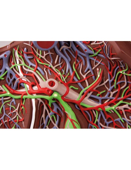 Este extraordinario modelo anatómico representa una sección del hígado humano, ampliada 1,5 veces su tamaño natural.