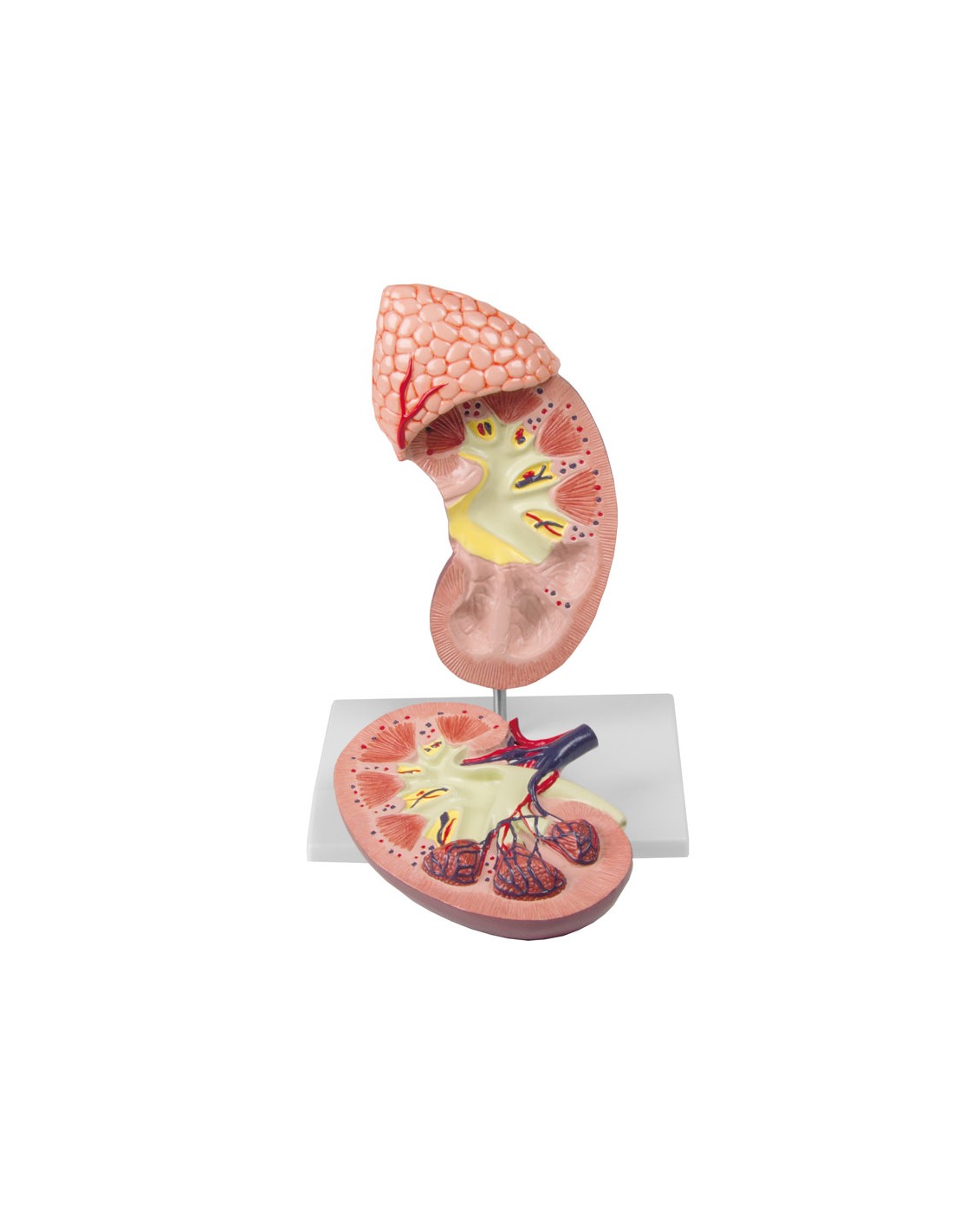 Este modelo en 2 partes del riñón humano con glándula suprarrenal, aproximadamente 2 veces el tamaño real, muestra las estructuras internas, incluyendo la corteza renal, la médula renal, las pirámides renales, los cálices renales, la pelvis renal, los uréteres y las uniones de las arterias y venas renales.