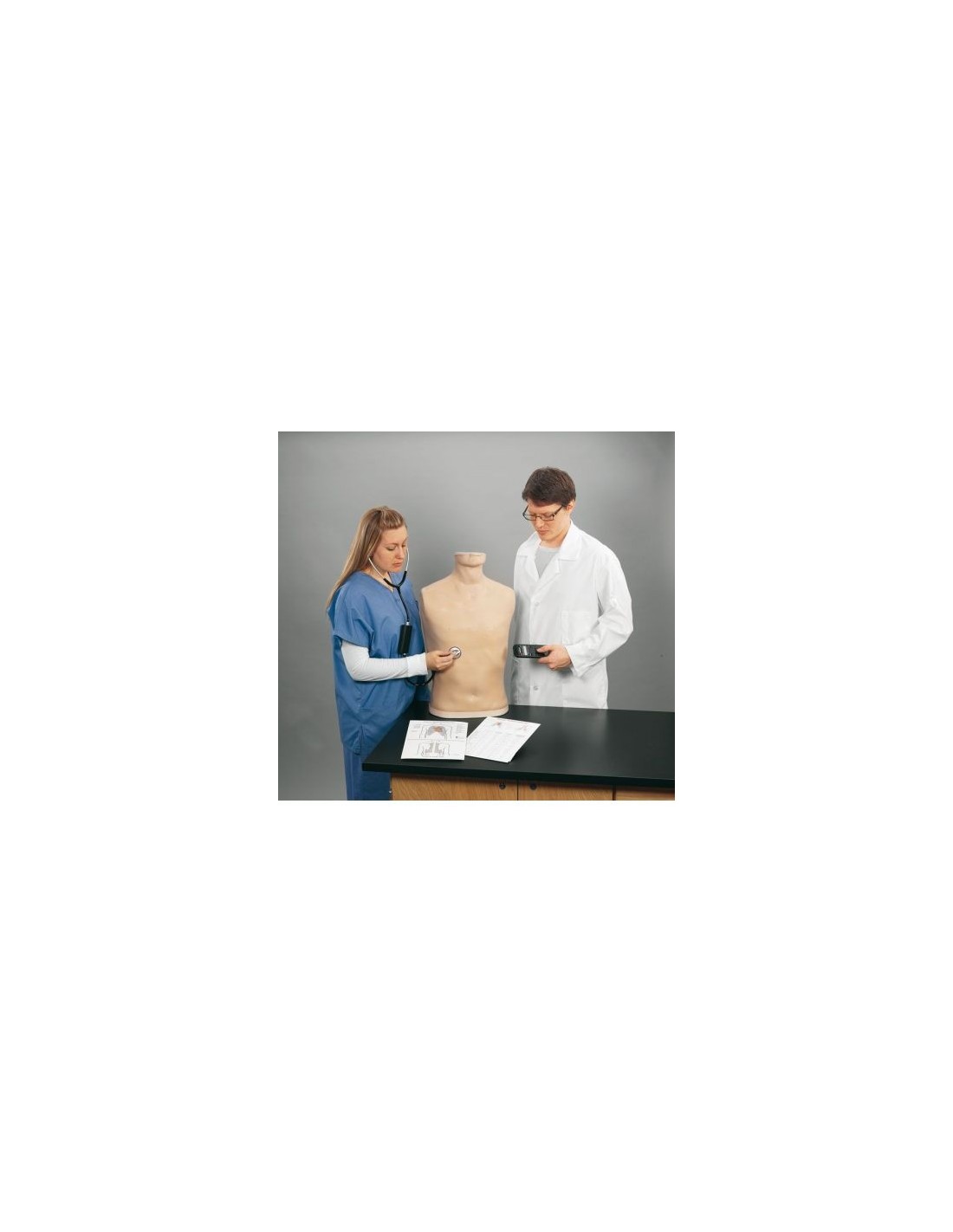 El simulador incluye un torso de piel suave, un SmartScope y un control remoto digital con pantalla en inglés.
