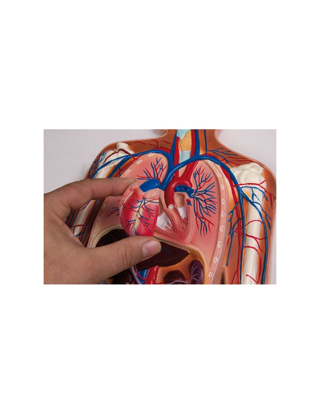 El modelo muestra claramente la circulación pulmonar, el corazón con sus cámaras, aurículas y válvulas, los grandes vasos y el suministro de sangre a las extremidades.
