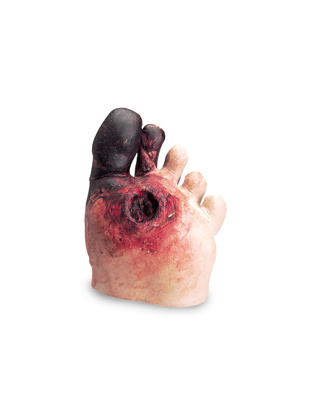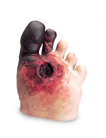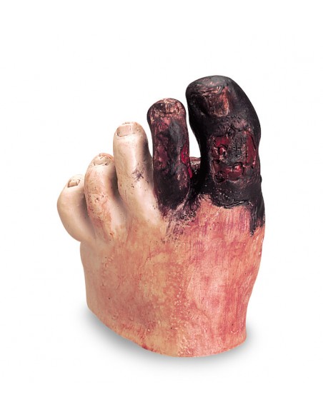 Este modelo de pie realista a tamaño natural muestra los síntomas típicos del síndrome del pie diabético.