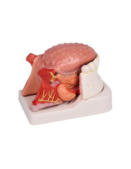 Este extraordinario modelo anatómico didáctico muestra el maxilar inferior hasta el segundo molar, la lengua con los músculos del suelo de la boca en la parte central y la glándula sublingual y submandibular derecha.