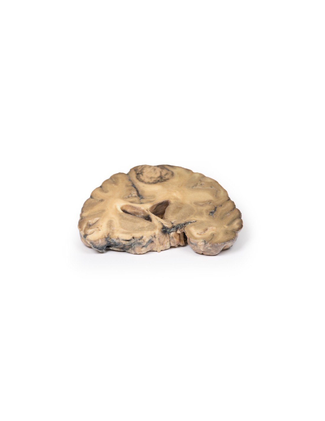 Esta muestra de cerebro se corta en el plano coronal. En el lóbulo frontal derecho se evidencia un tumor circunscrito, abigarrado, de color rosa grisáceo. El tumor involucra la sustancia gris y blanca. La compresión del ventrículo lateral derecho por la lesión también es evidente con el desplazamiento de las estructuras de la línea media.