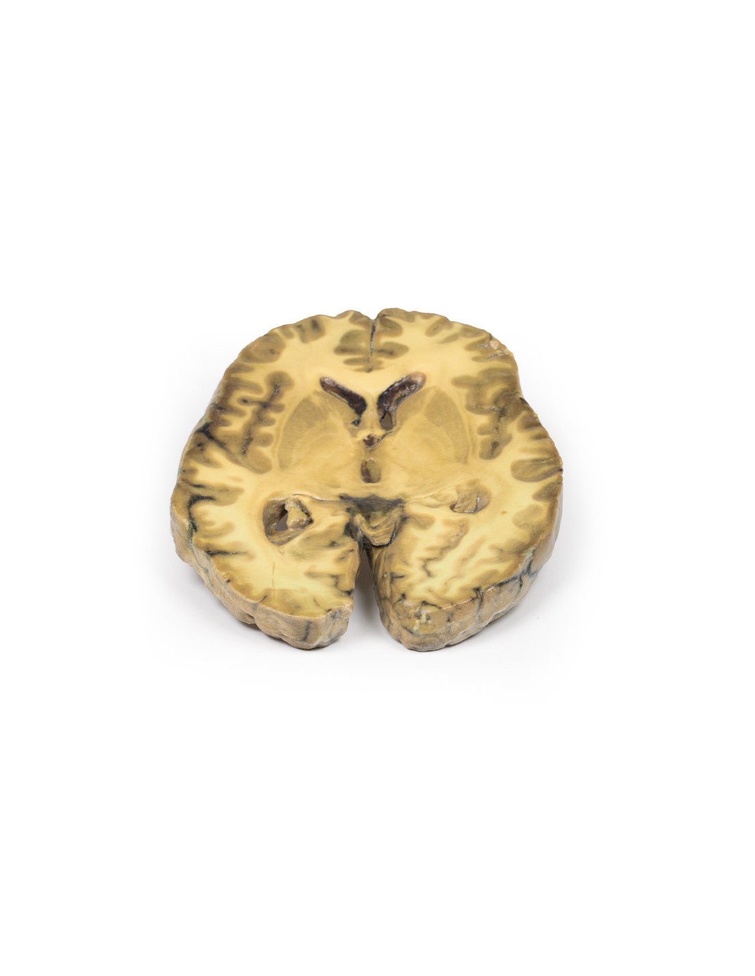 Este modelo es un ejemplo de ventriculitis, con meningitis neumocócica y neumonía basal derecha también encontradas en la autopsia. Corte horizontal a través de ambos hemisferios cerebrales muestra ambos ventrículos laterales. Los ventrículos muestran un revestimiento ependimario engrosado y rugoso con acumulación de restos celulares alrededor del plexo coroideo y también en el asta anterior. La superficie inferior muestra cambios similares y también muestra la disposición normal del núcleo caudado, el núcleo lentiforme y la cápsula interna.