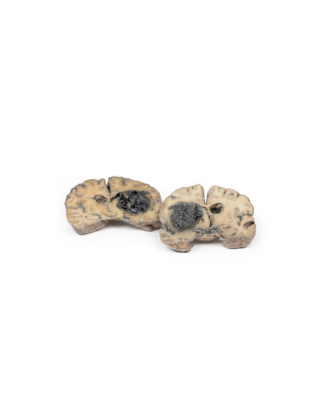 Los ejemplares son cortes coronales del cerebro a nivel de los cuerpos mamilares (espécimen en el que se ve la superficie cortada del tronco encefálico donde también se ven los pedúnculos cerebrales y la sustantia nigra) y más anteriormente donde se incluyen parte de ambos lóbulos temporales . Un enorme coágulo de sangre ha reemplazado el tejido cerebral en la región de los ganglios basales izquierdos y la cápsula interna. La hemorragia se originó en esta área y se rompió hacia el ventrículo lateral izquierdo y su asta temporal, destruyendo las paredes del ventrículo lateral izquierdo y extendiéndose hacia el tejido cerebral adyacente. El ventrículo lateral derecho también está lleno de sangre, pero sus paredes están intactas. El coágulo de sangre forma una lesión que ocupa espacio, que ha agrandado el hemisferio cerebral izquierdo, provocando un desplazamiento de las estructuras de la línea media hacia la derecha.