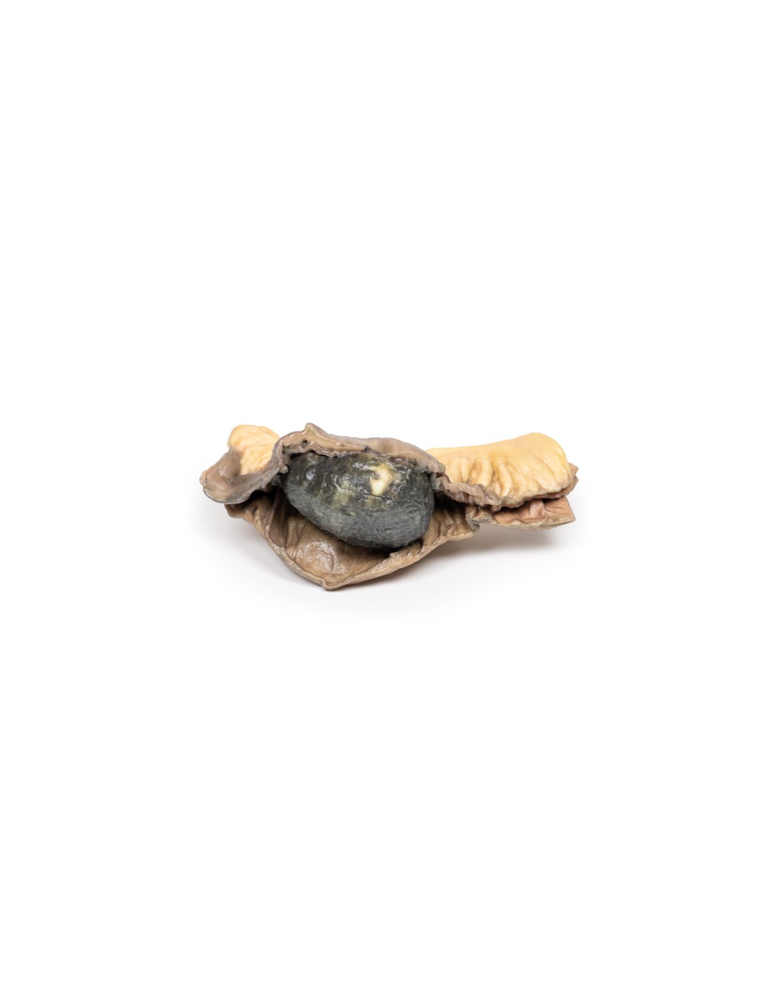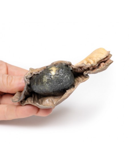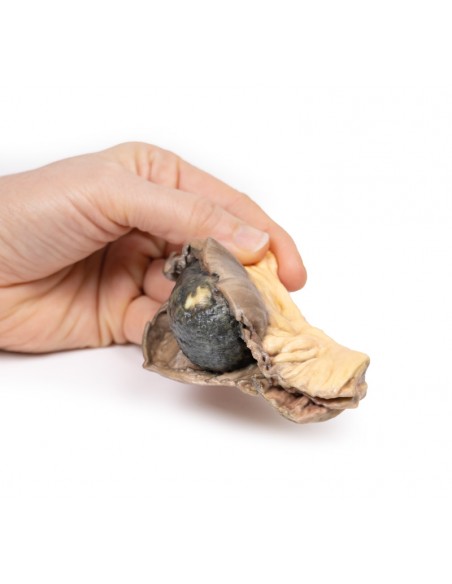 Este segmento del intestino delgado se abrió para mostrar un gran cálculo biliar ovoide pigmentado con una superficie rugosa. Este es un ejemplo de íleo biliar.