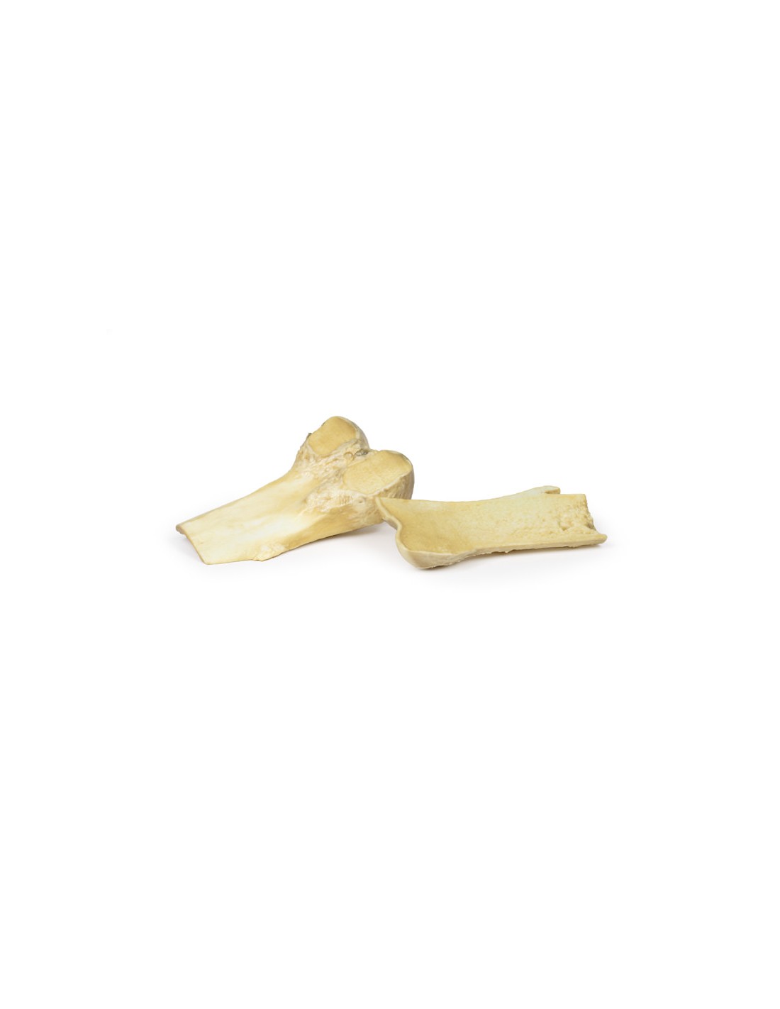 La muestra es el extremo inferior del fémur derecho del paciente, que se cortó en el plano coronal y se montó para visualizar las superficies externas. Una protuberancia ósea pediculada de 2 cm de longitud sobresale de la cara medial de la diáfisis femoral 7 cm por encima del cóndilo medial. La protuberancia está compuesta de hueso normal con una fina capa de cartílago hialino en el extremo. Se trata de un ejemplo de osteocondroma.