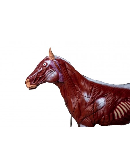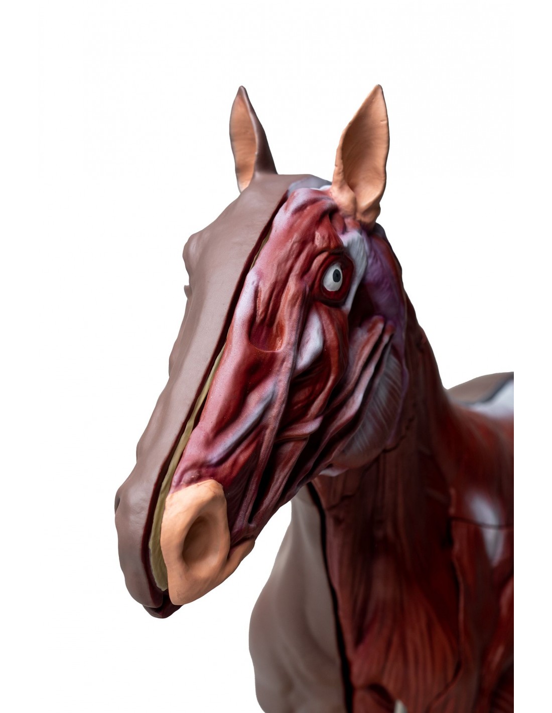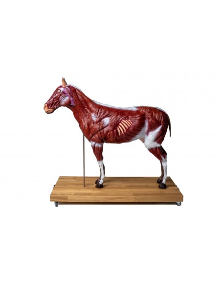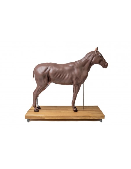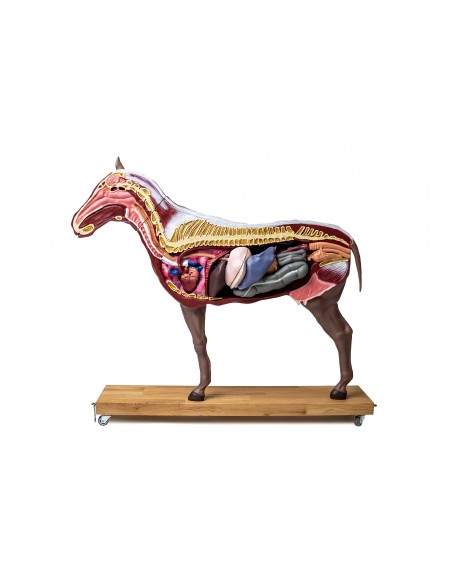 Modelo de caballo (yegua) a tamaño natural 1/3. Destinado a fines educativos, para alumnos y estudiantes. El modelo está montado sobre una base con ruedas y puede dividirse en dos partes a lo largo del plano sagital.