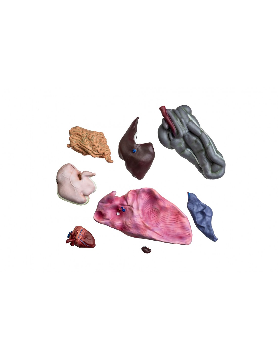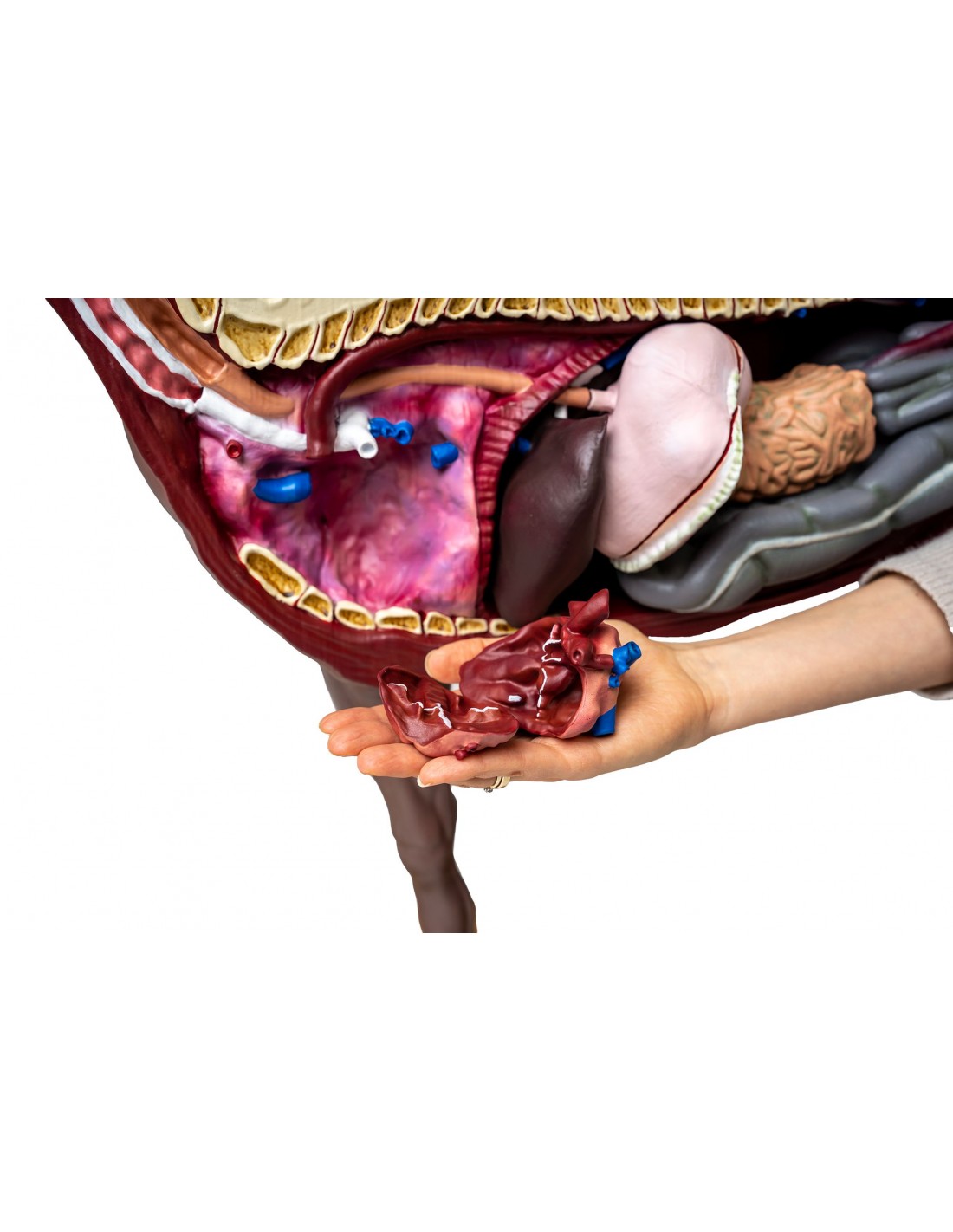 La mitad derecha muestra la piel exterior del animal, mientras que la mitad izquierda muestra los músculos del cuerpo y las extremidades. Cuando se separan las dos mitades, el lado izquierdo muestra el tórax y la cavidad abdominal con órganos desmontables, mientras que el lado derecho del modelo muestra los principales vasos sanguíneos, el corazón y la pared de la cavidad abdominal con órganos desmontables.