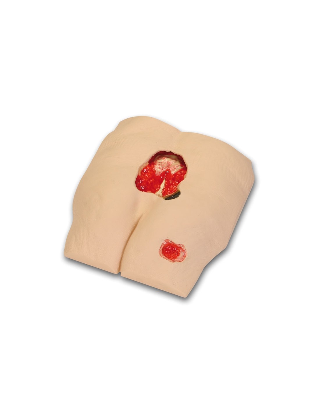 Diseñado para la enseñanza y la capacitación con dispositivos de cierre asistidos de vacío y terapia de heridas con presión negativa. Este modelo presenta una úlcera por presión sacra grande en etapa IV, con escara, grasa subcutánea, miner, tunelización, esfacelo, escara y hueso expuesto (con osteomielitis) y una etapa III Úlcera por presión con grasa subcutánea y tejido de granulación.