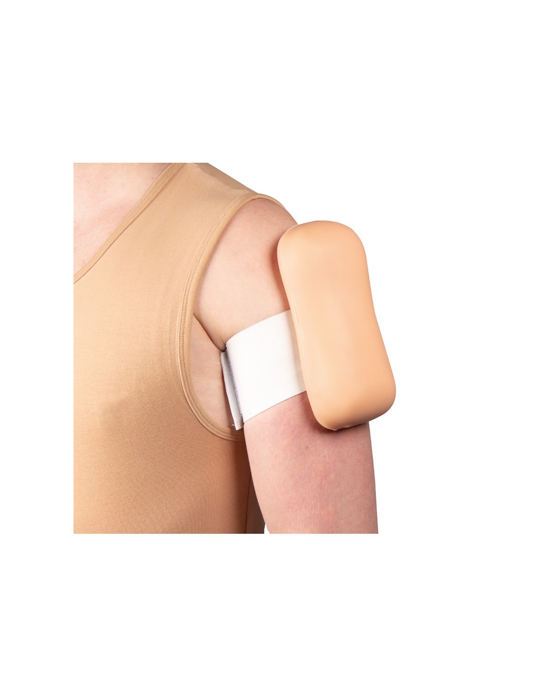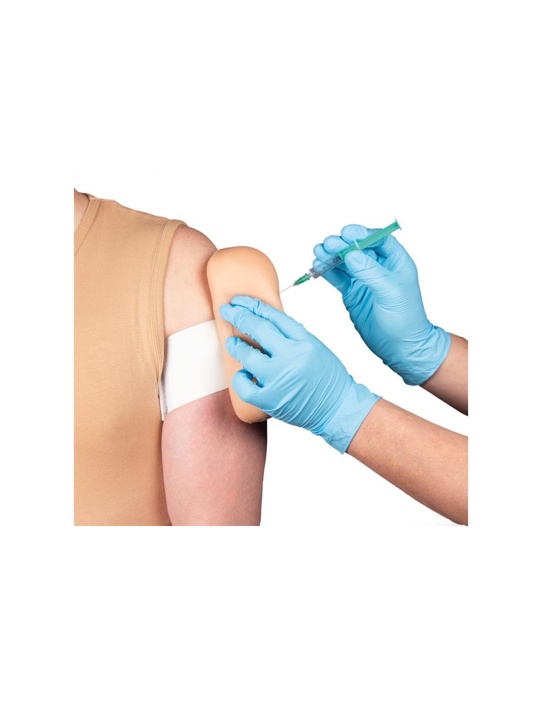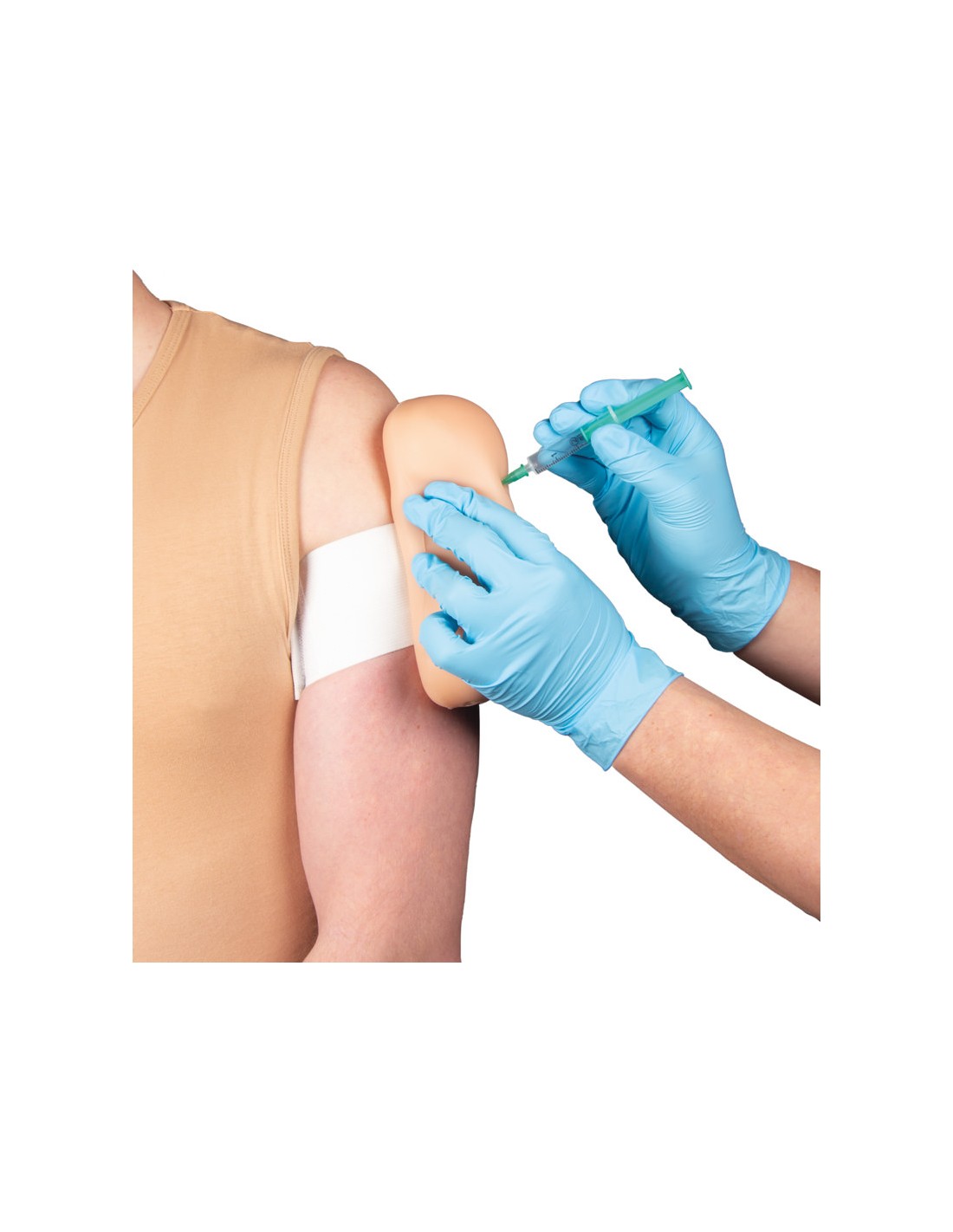 El simulador se puede abrochar y, por lo tanto, simula la parte superior del brazo humano. La anatomía del músculo del hombro se reproduce de forma real y palpable y sirve como punto de referencia para la punción.