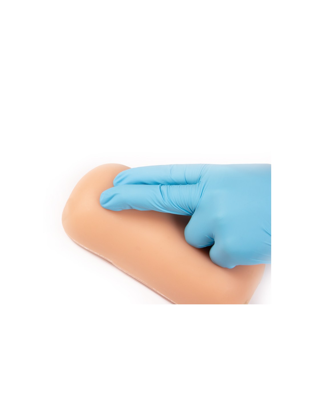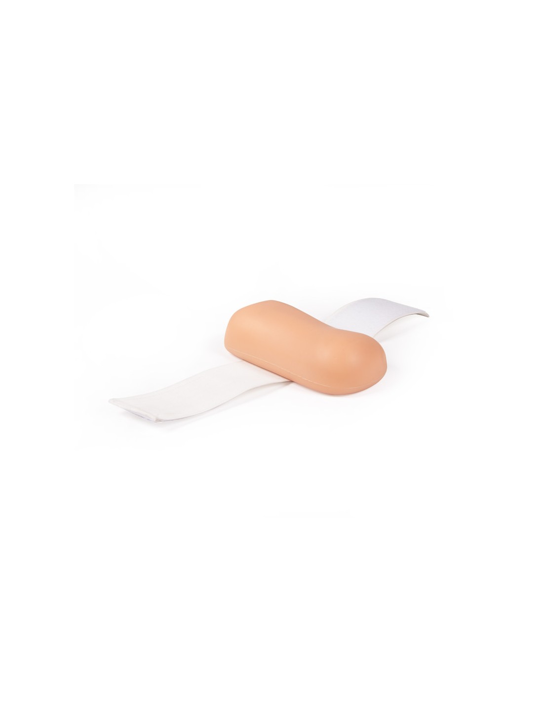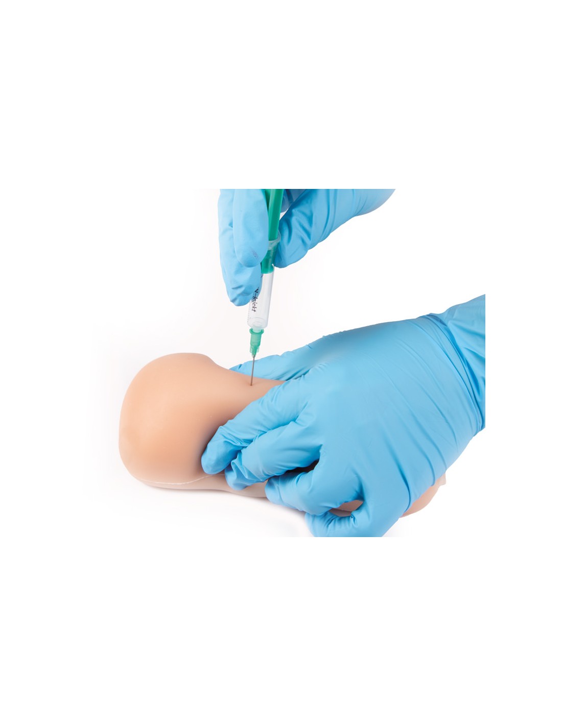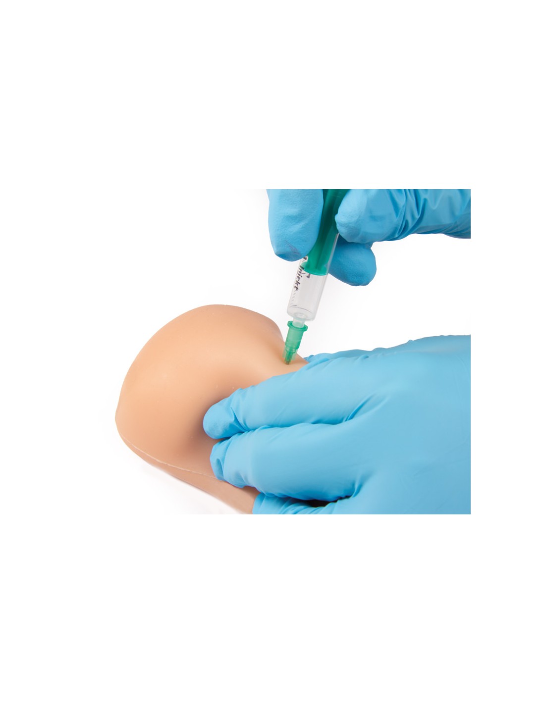 El simulador se puede abrochar y, por lo tanto, simula la parte superior del brazo humano. La anatomía del músculo del hombro se reproduce de forma real y palpable y sirve como punto de referencia para la punción.