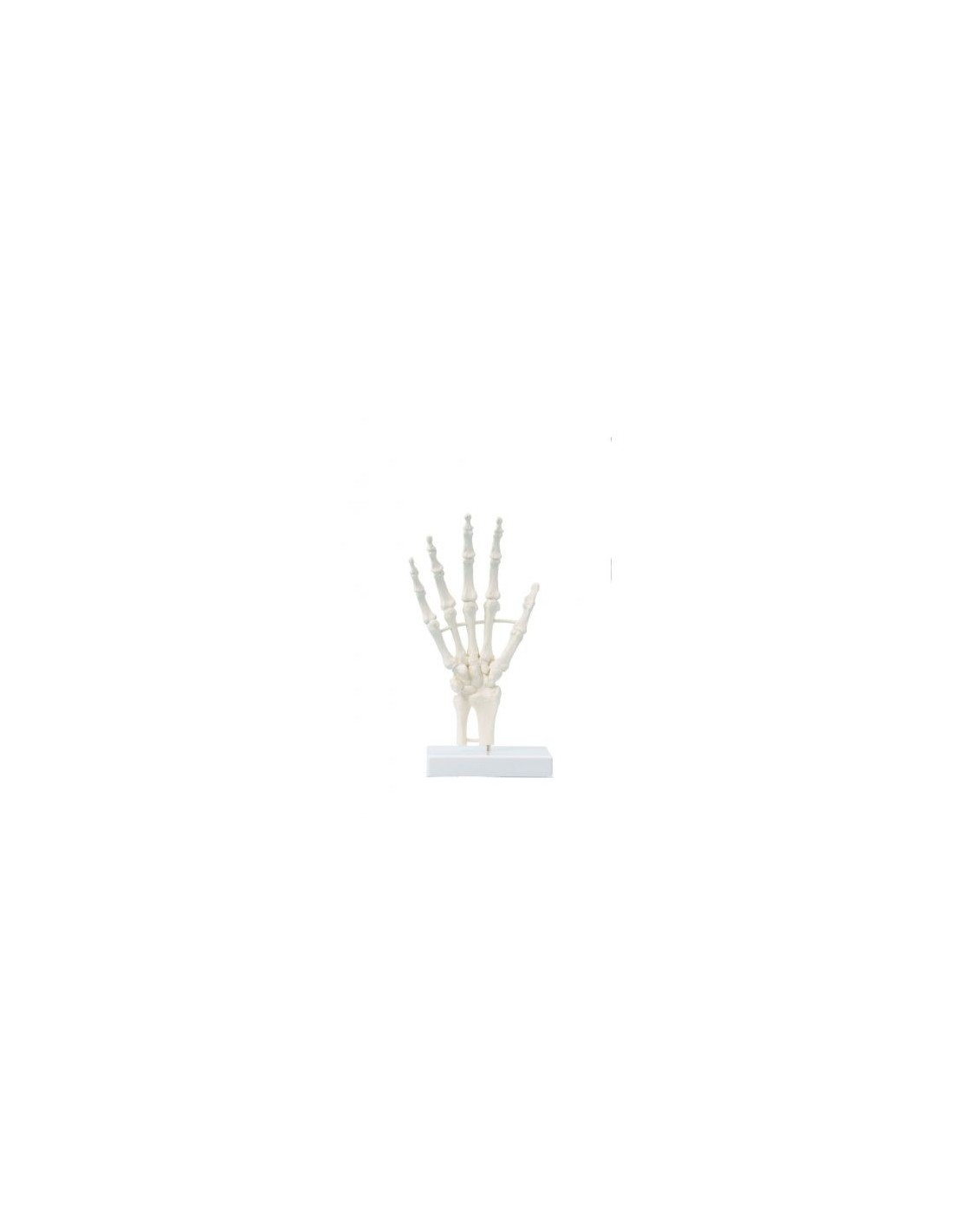Modelo anatómico didáctico de la articulación del esqueleto de la mano en tamaño real, montado sobre alambre.