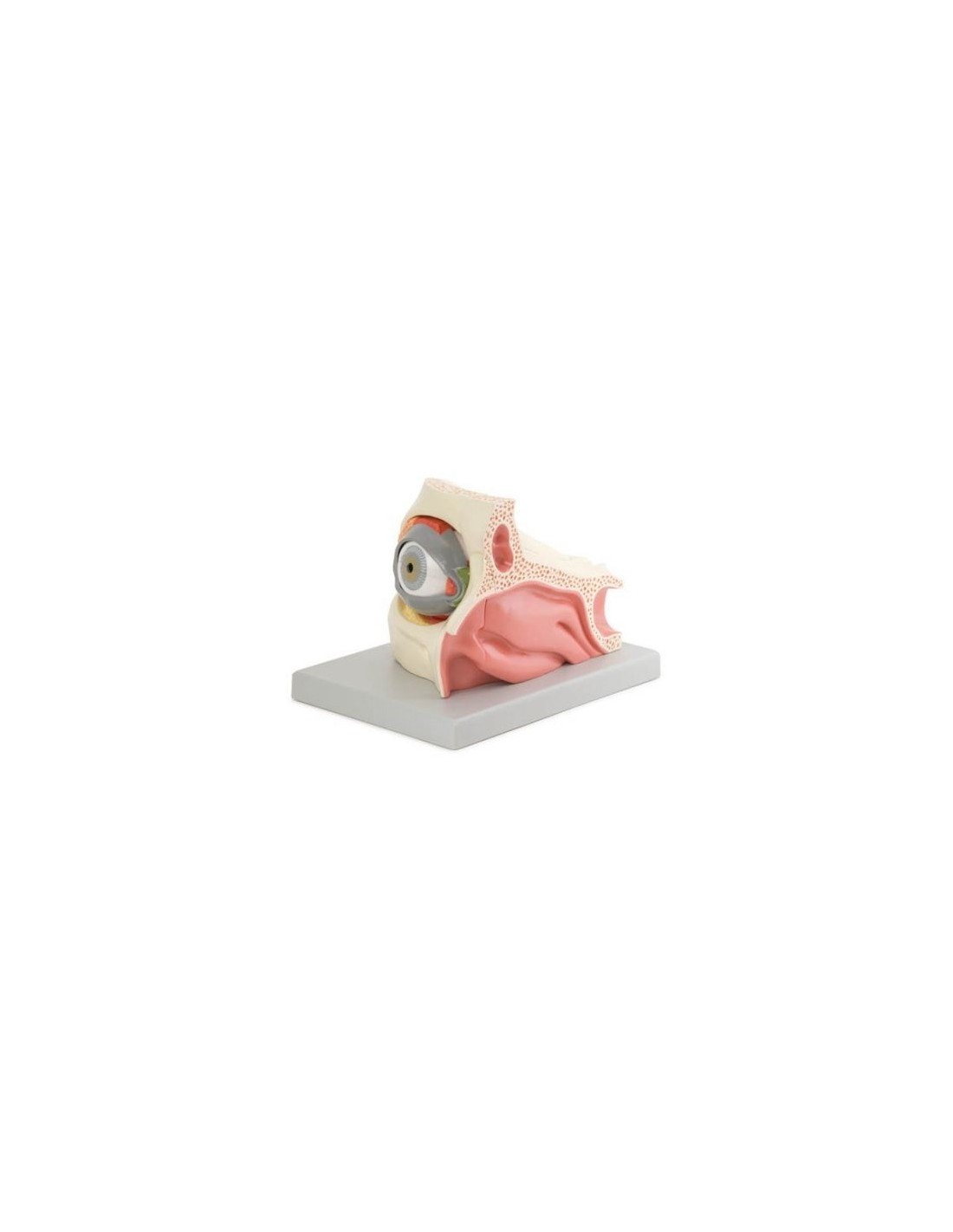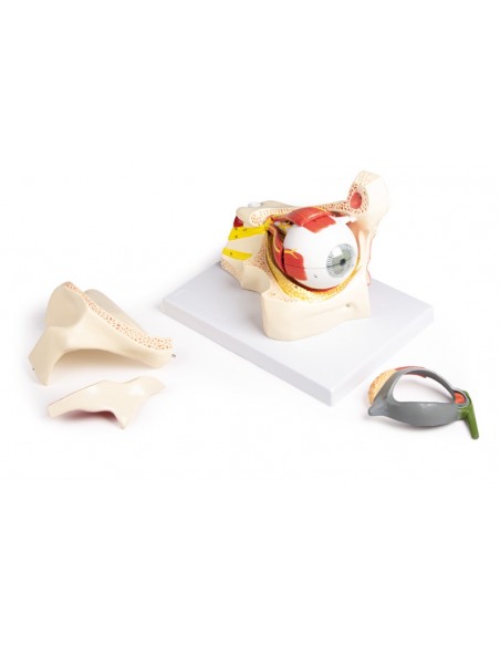 Modelo anatómico del ojo ampliado 2,5 veces, descomponible en 13 partes, con órbita y párpado.