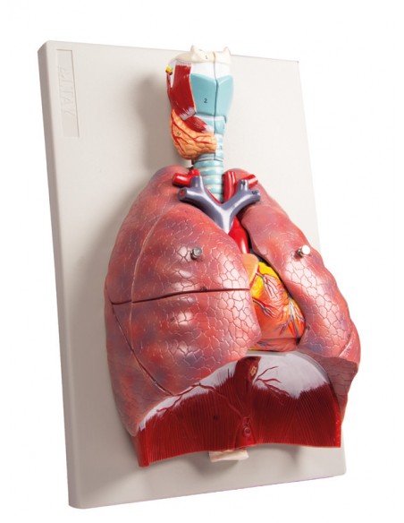 El modelo consta de siete partes, por lo que la laringe se puede abrir en el plano sagital y los pulmones en el plano frontal.