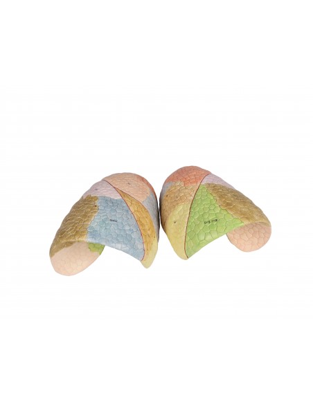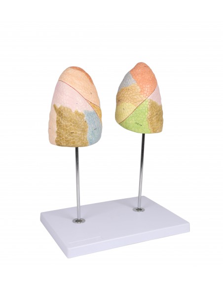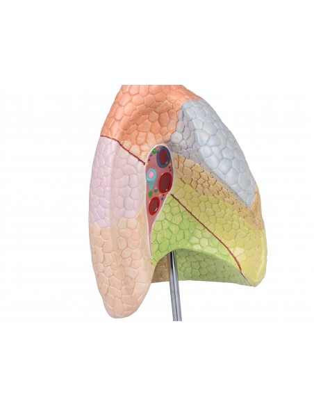 .Este modelo de tamaño natural muestra claramente la anatomía segmentaria de los pulmones izquierdo y derecho. Los distintos lóbulos están pintados de diferentes colores para resaltar su posición.