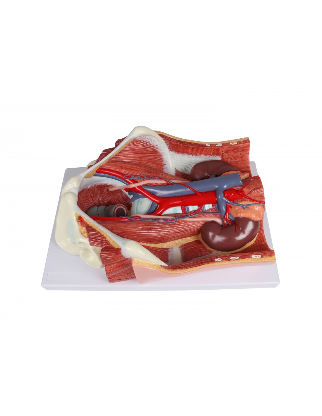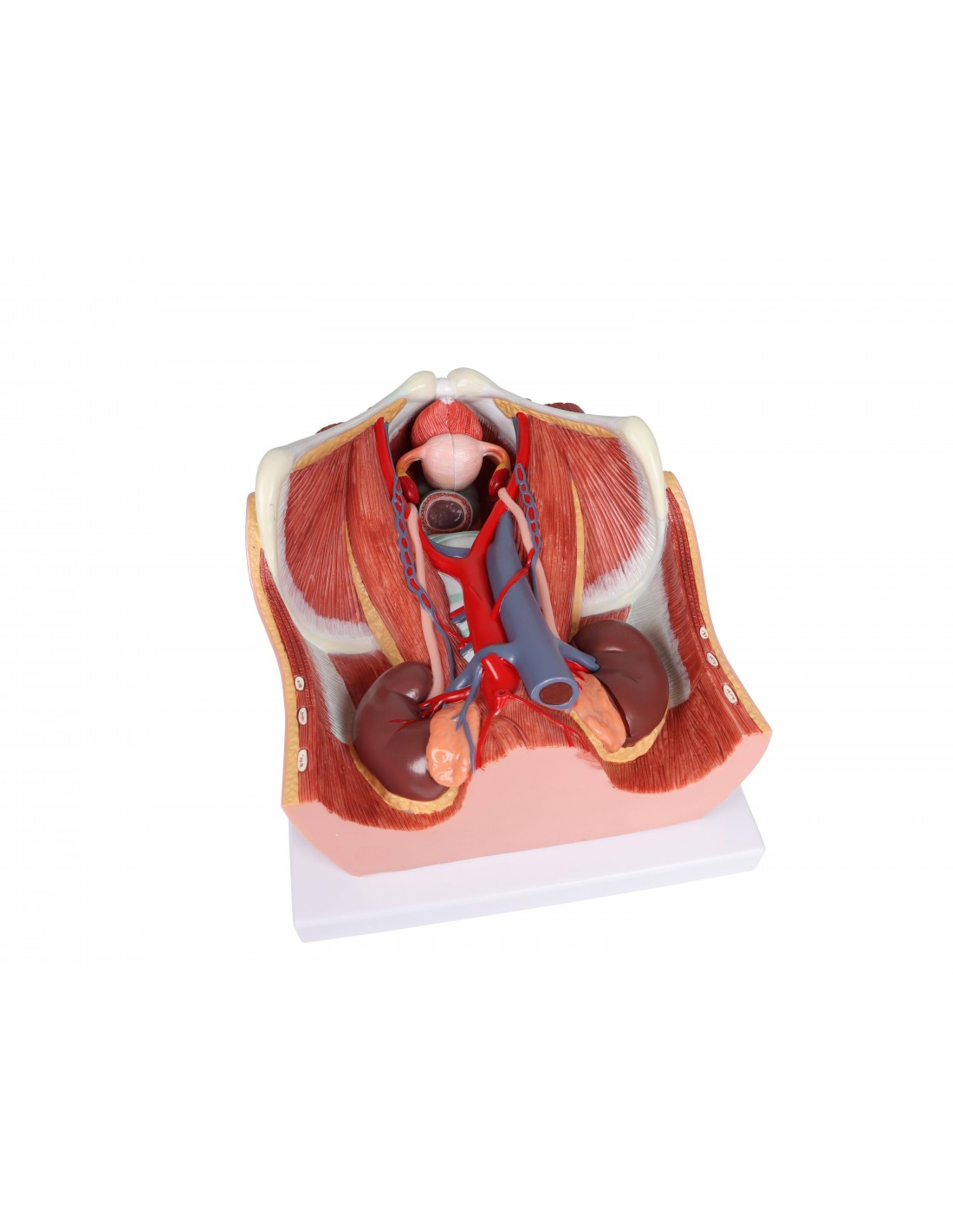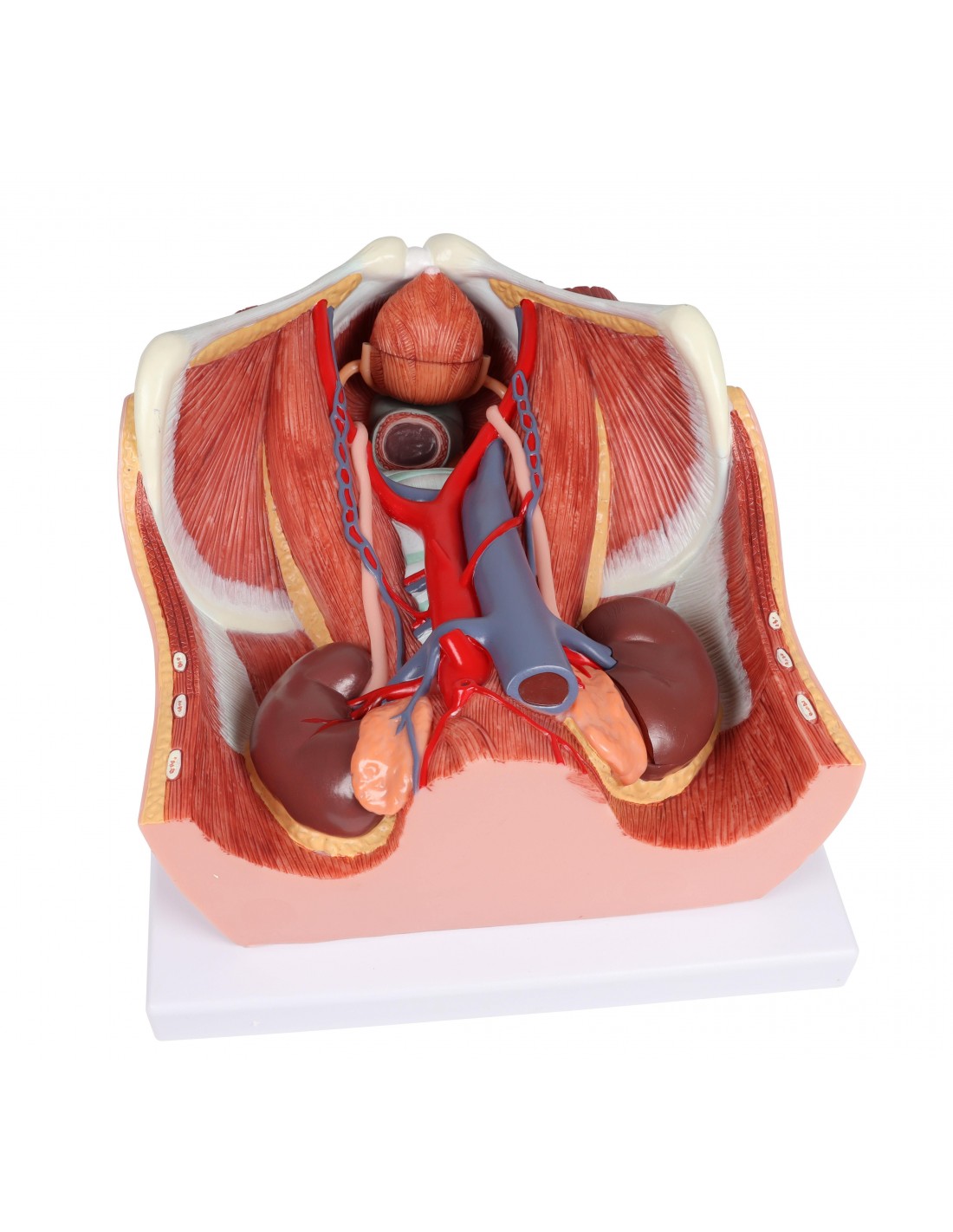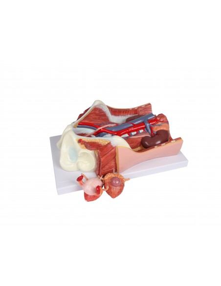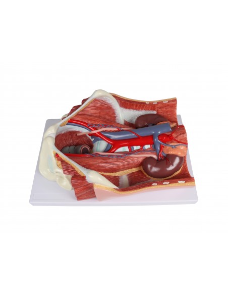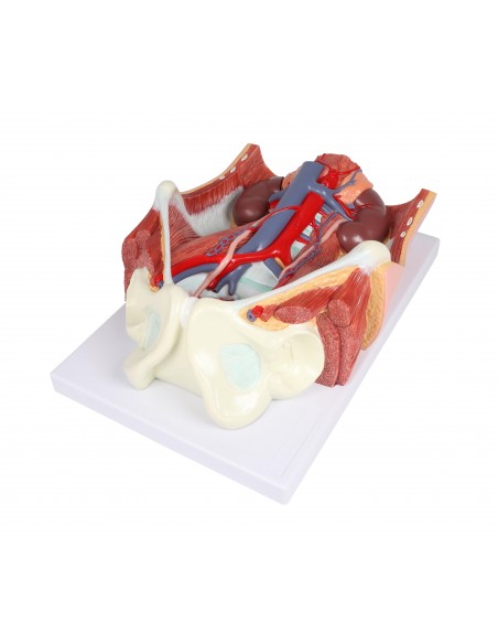 Este modelo todo en uno del sistema urinario bisexual ofrece una visión completa del sistema urinario, mostrando las estructuras de la cavidad retroperitoneal, la pelvis grande y pequeña con huesos y músculos, la vena cava inferior, la aorta con sus ramas, incluidos los vasos ilíacos, el tracto urinario superior, el recto y el riñón con la glándula suprarrenal.
