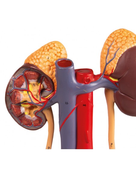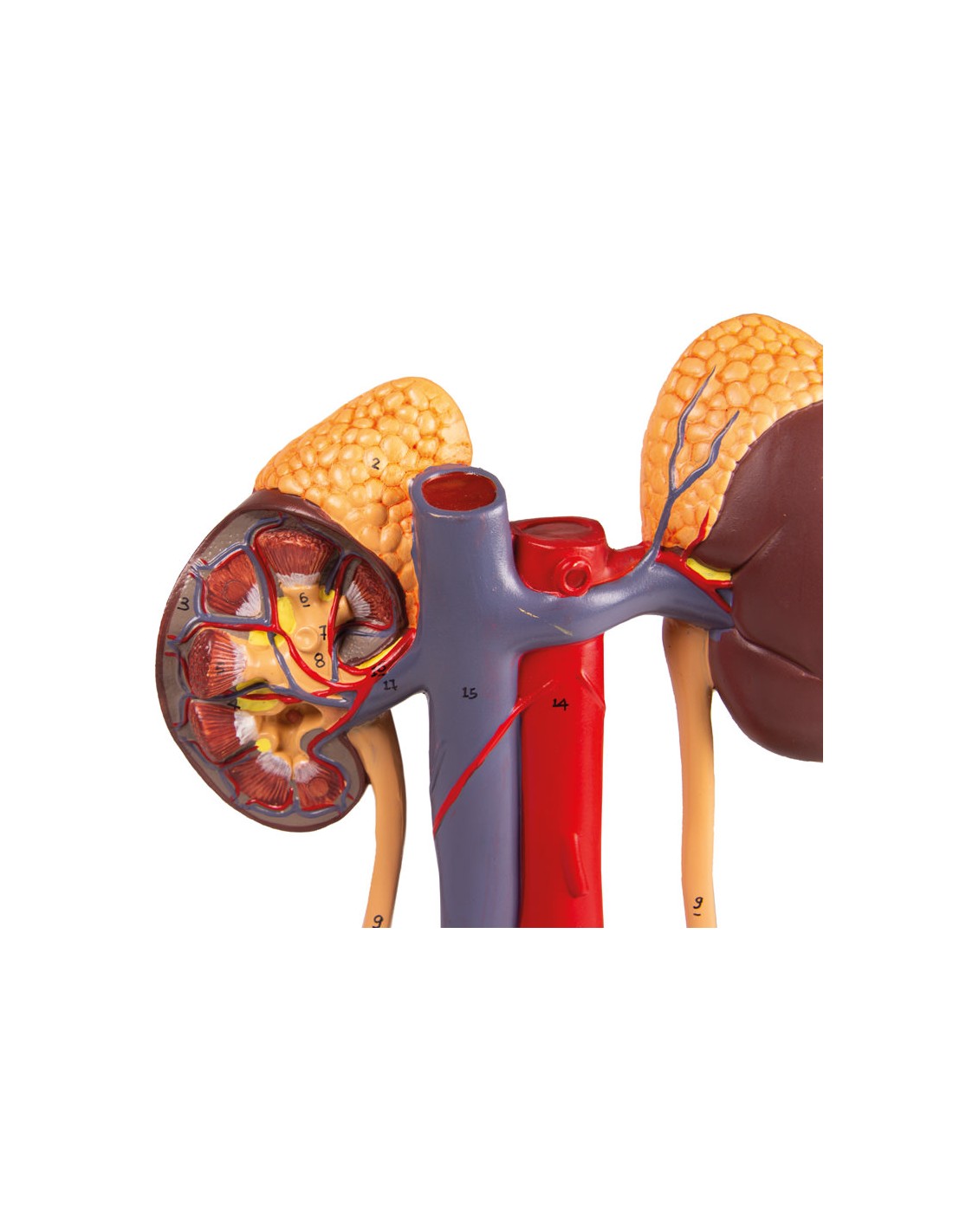 Este modelo anatómico en 5 partes de tamaño natural muestra los componentes esenciales del aparato urinario, la vena cava y la aorta abdominal.