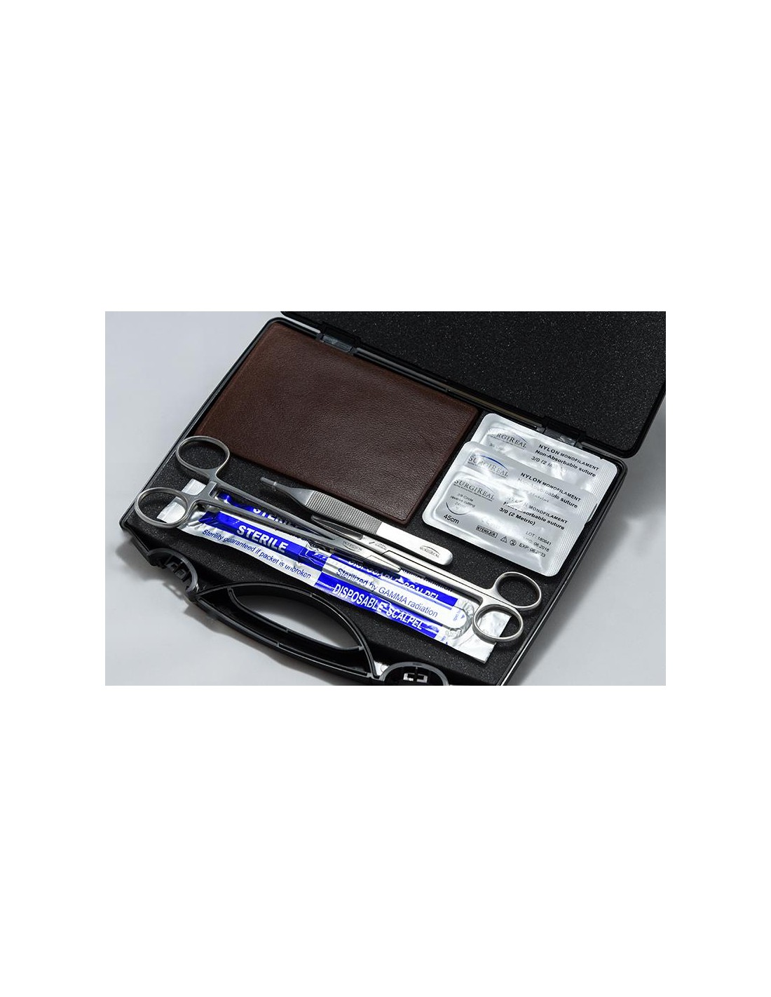 El kit de entrenamiento de sutura pequeña de 6 capas combina una almohadilla de sutura de cuero oscuro con un conjunto de herramientas de sutura y tres paquetes de suturas de ejercicio 3-0 no estériles. Instrumental incluido en el kit: 1 bisturí desechable n. 10, 1 pinza tisular Adson (1x2), 1 tijera Stich, 1 portaagujas Mayo Hegar 6
