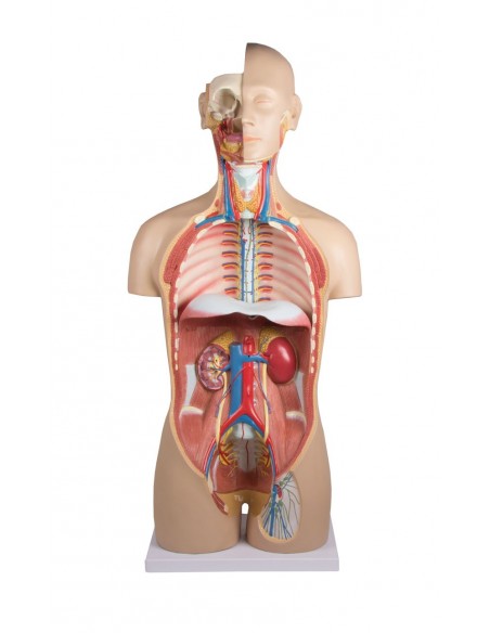 Este excepcional modelo didáctico anatómico representa un torso humano completo de tamaño natural con la espalda abierta. Está compuesto por 27 partes que reproducen las estructuras anatómicas más importantes del cuerpo humano.