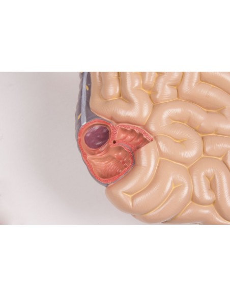 La cabeza se disecciona para mostrar el cráneo, el cerebro, la boca, la región de la garganta y el ojo.