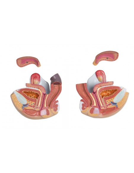 Los sistemas urogenitales masculino y femenino están separados y encajan indistintamente en la parte principal del tronco. La espalda abierta expone las capas musculares, la columna vertebral, los nervios espinales y una vértebra removible con médula espinal.
