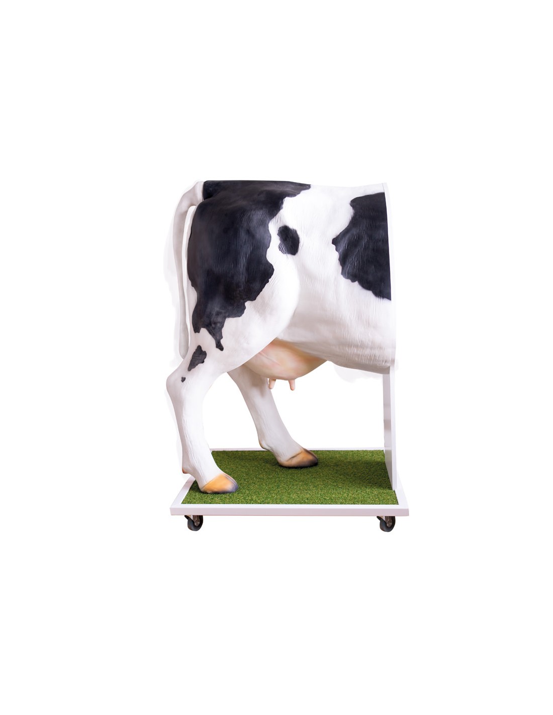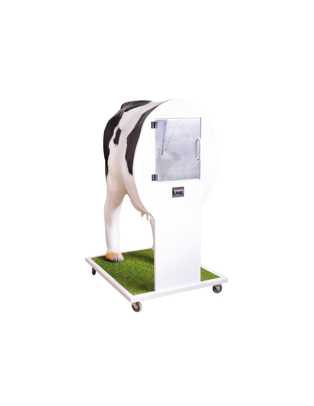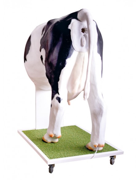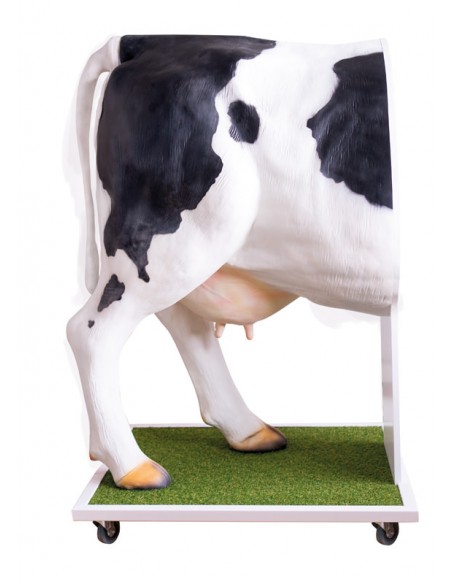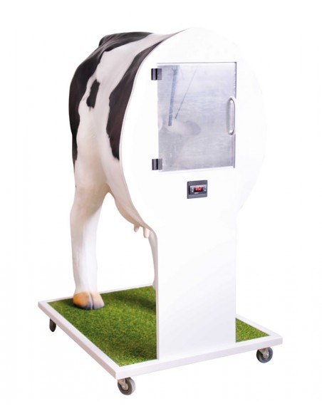 El simulador representa la mitad trasera de una vaca reproductora sobre una base con ruedas. Permite el entrenamiento y la observación de la manipulación de la palpación durante el proceso de inseminación y el tacto rectal.