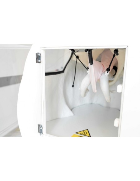 El set contiene un sistema completo de reproducción artificial, un útero en celo y una pieza de mano. Una representación intercambiable de tamaño natural del aparato reproductor con estructuras anatómicas características, montada en la posición anatómica correcta en la estructura del simulador, suspendida en la cavidad pélvica imita de forma natural una suspensión natural hecha de materiales flexibles, imitándolos y ofreciendo una sensación de tratamiento realista de tejido vivo - se aplica a los elementos externos (vulva) e internos (cuello uterino). Los órganos internos del modelo pueden calentarse a temperatura natural.