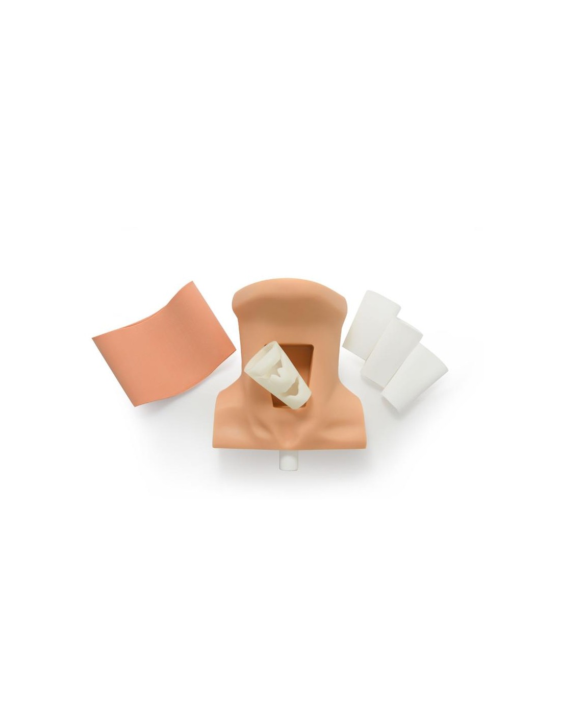 Dentro del paquete encontrará 1 base de cuello, 1 piel simulada, 1 inserto de cartílago tiroides simulado, 3 membranas tiroideas simuladas, así como instrucciones de instalación, mantenimiento y uso del modelo.